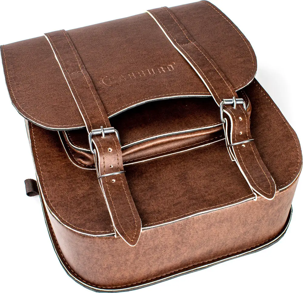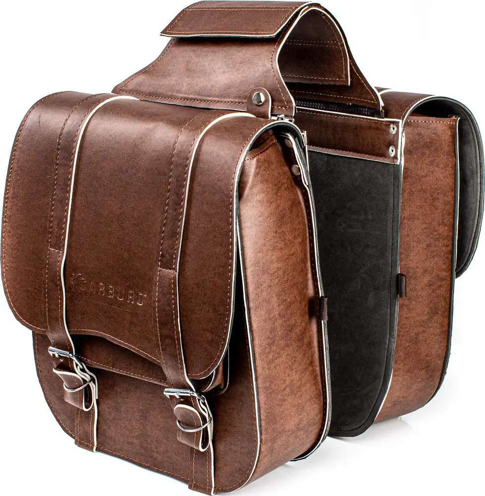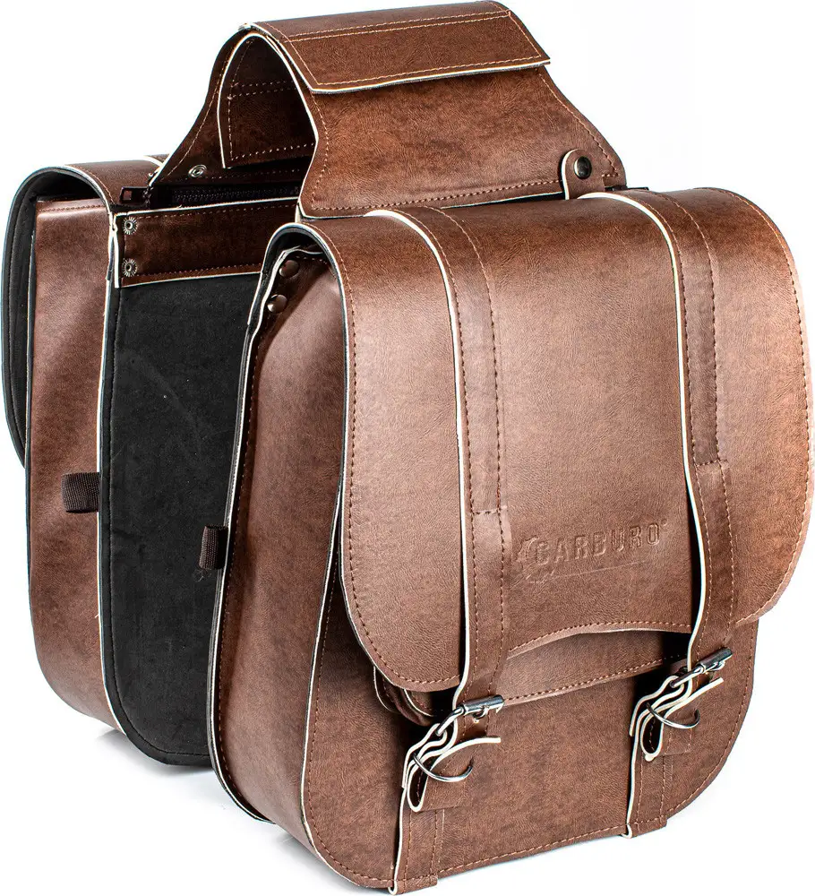 Coppia borse laterali in pelle sintetica effetto invecchiato, dallo stile Custom e/o Cafe Racer. Le Mustang di Carburo dispongono di fibbie cromate molto resistenti con clip per sgancio rapido.